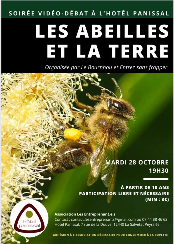 Mardi 28 octobre soirée vidéo/débat LES ABEILLES ET LA TERRE de Jeanne | 10 octobre 2025 - 21 h 35 min |10 octobre 2025 Non classé Organisée par Le Bournhou et Entrez sans frapper à partir de 10 ans Participation libre mais nécessaire ( min 3 euros ) Pour marque-pages : Permaliens.